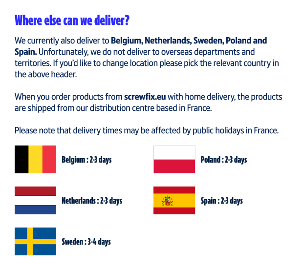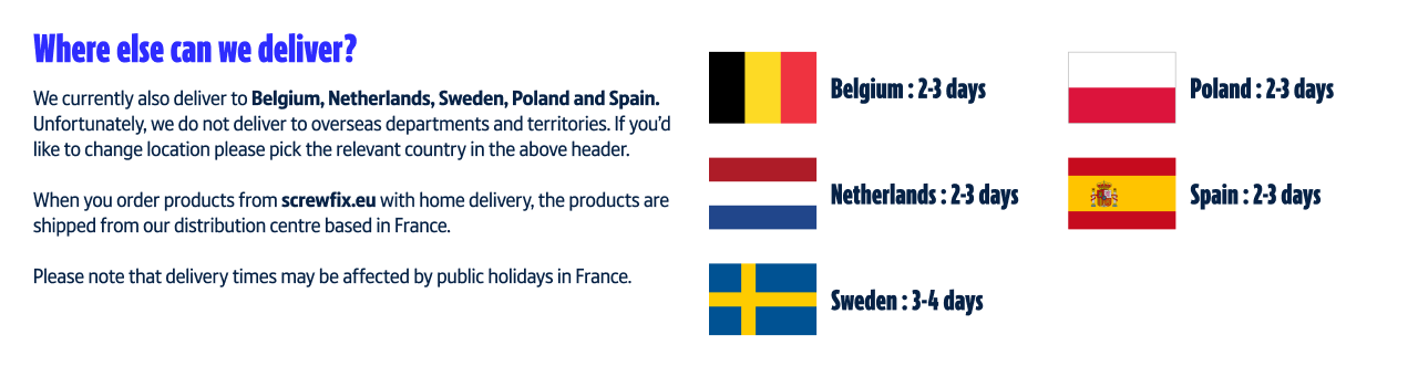 It is important to us to provide quality service to our customers, and we strive to make things easy for you. If you have a question or need assistance, please contact our customer service at eucontact@screwfix.eu (Monday to Friday 08:30 – 17:00 CET).