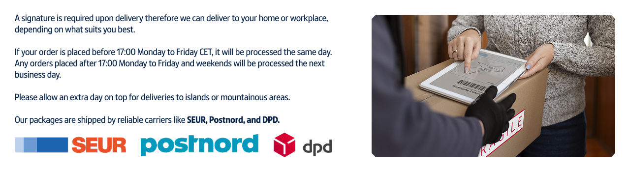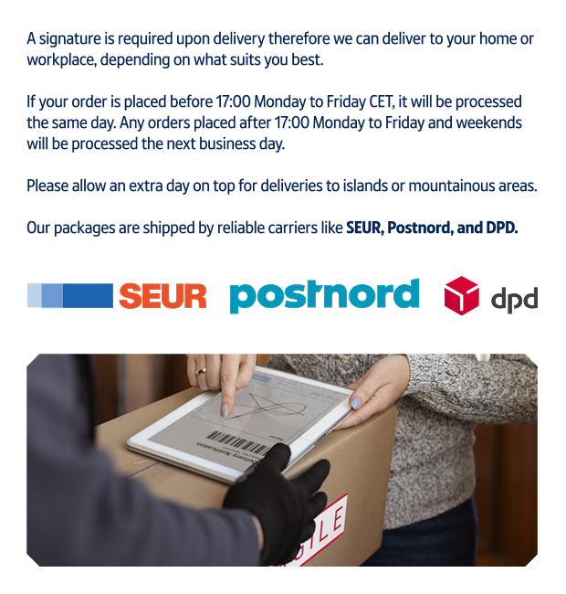 We offer FREE delivery on all orders over 75 €.For orders less than 75 €, our delivery fee is 5 €, inclusive of tax.